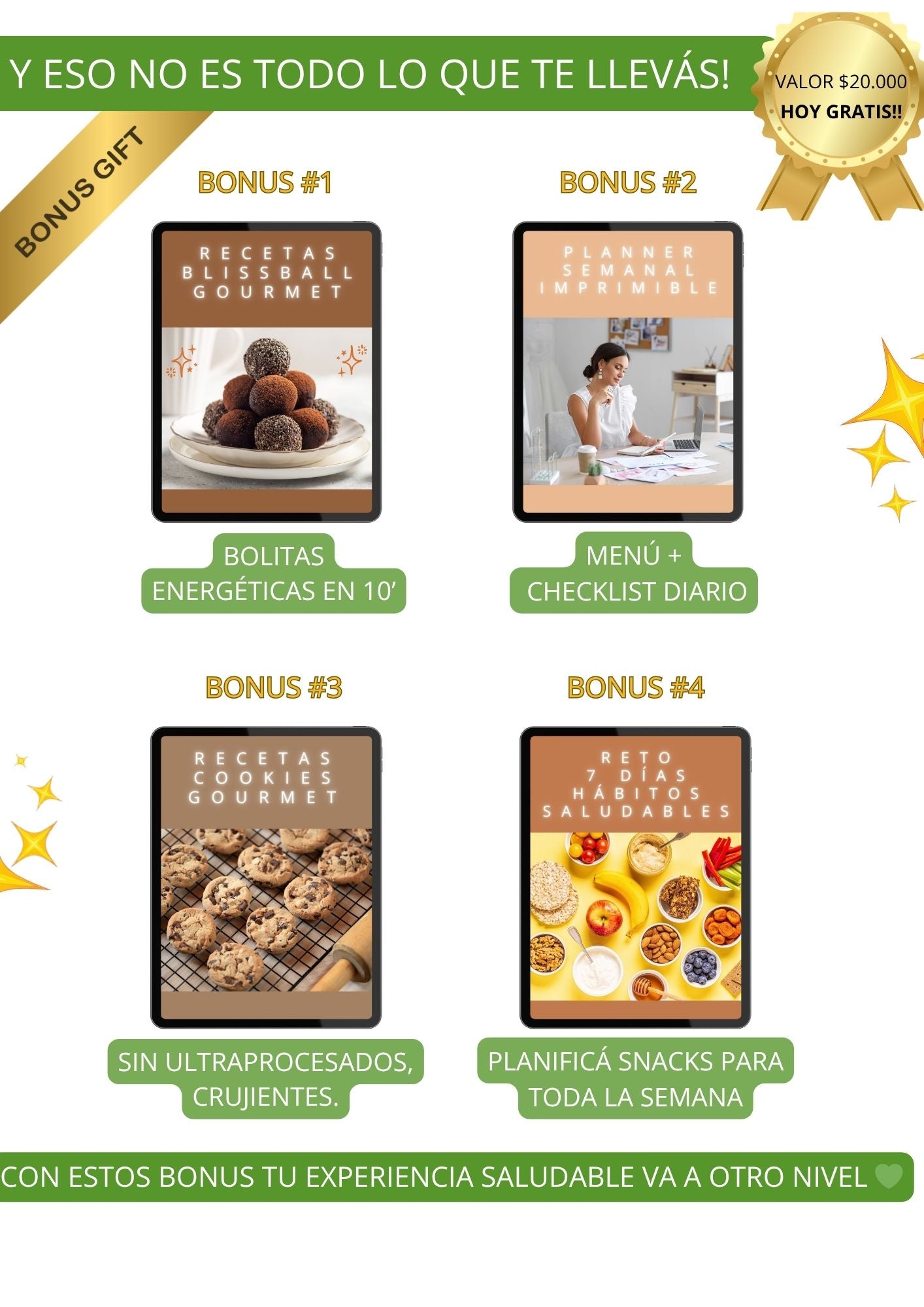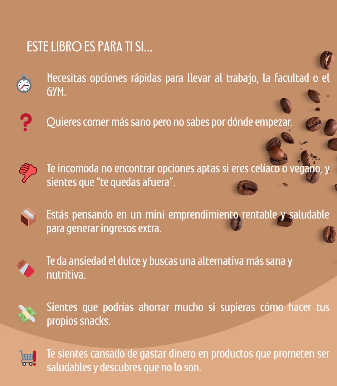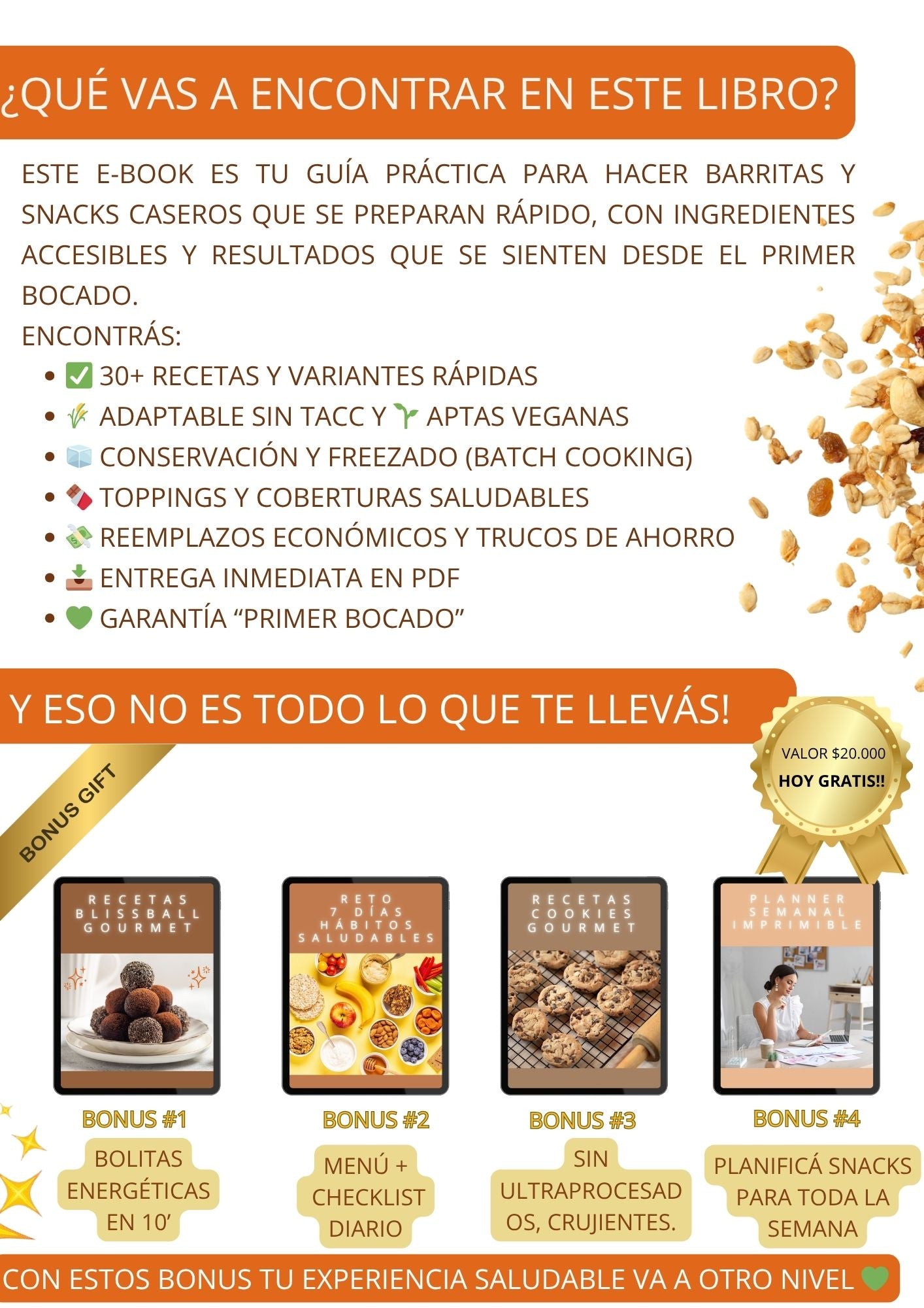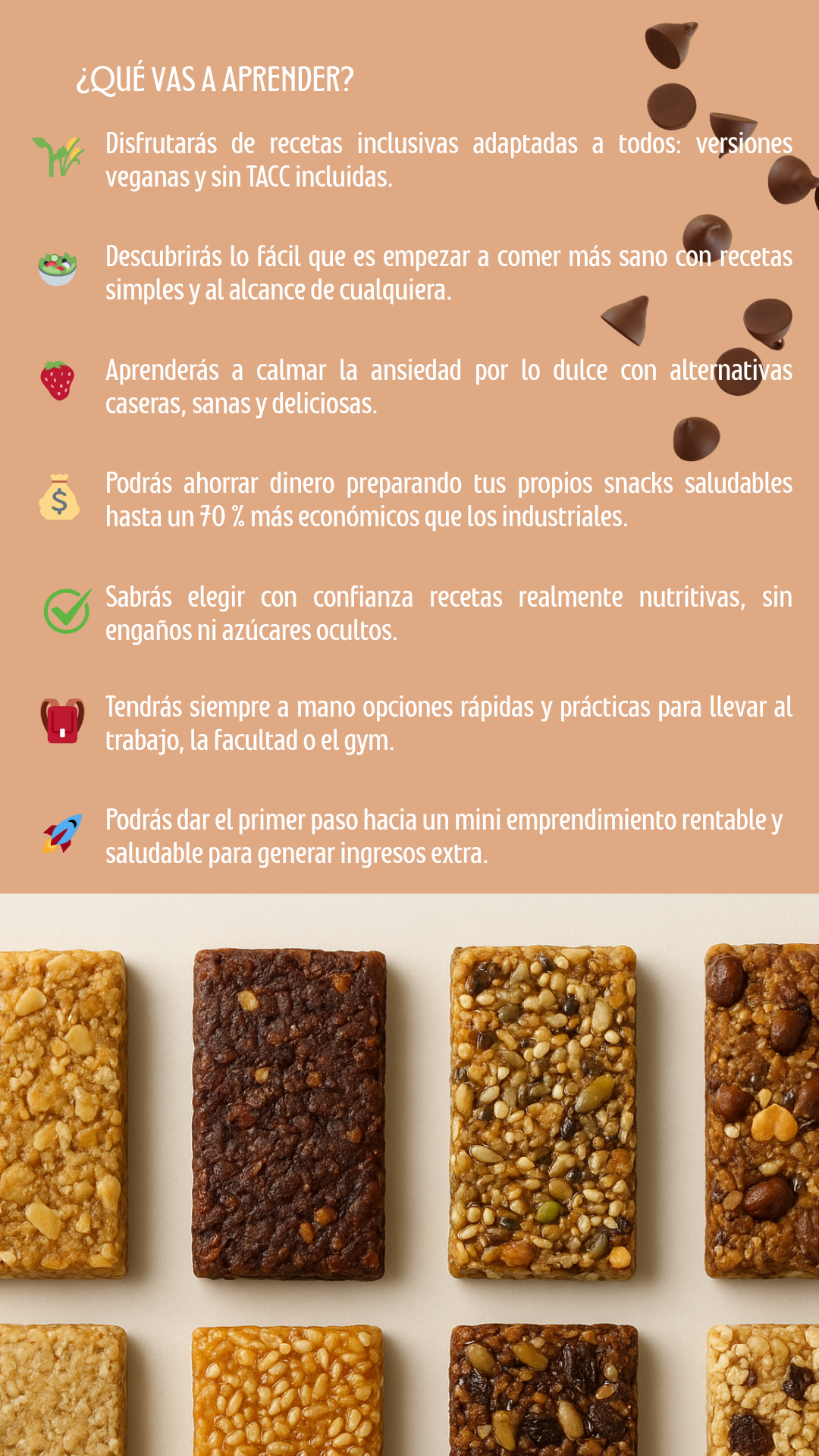 Descarga el ebook, prueba al menos una receta en casa y si en 7 días no sientes la diferencia entre un snack industrial y uno casero, te devolvemos tu dinero sin preguntas.